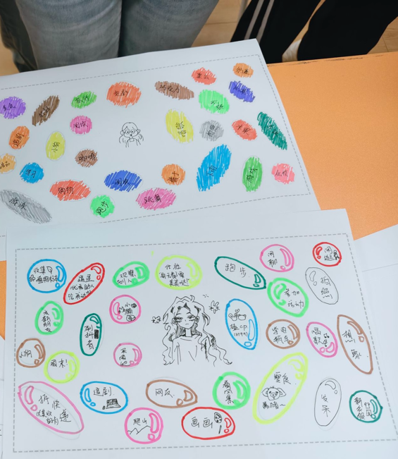 在这里,每个人都是自己世界的“幸福绘图师”。同学们在纸中央用画笔或文字留下独特的印记——或是简笔自画像,或是代表自己的符号与签名。其中一位女生描绘了一个外表酷炫的自己,而她身边却环绕着小狗、小猫,以及追星、画画等元素。这样的画面恰似缩影,那些围绕“我”的圈圈,逐渐被具体的人、事、物填满,构成了独属于每个人的“幸福能量图”。它不张扬,却温柔地提醒:所有让心灵柔软的事物,一直都在我们身旁。